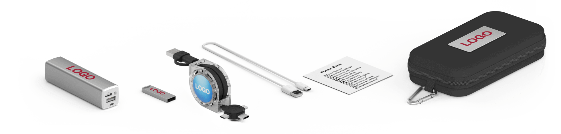 Combine 3 products in a handy Travel Merch Pack: Focus USB Flash Drive, Element Power Bank, Motion USB Cable. These carefully curated products can be branded with your logo, website address, slogan and more. The top of the Gift Case can also be Laser Engraved or Screen Printed in up to 4 colours. Any product colour combinations are allowed.