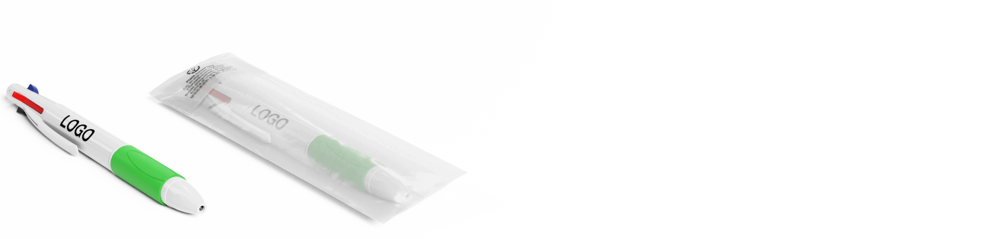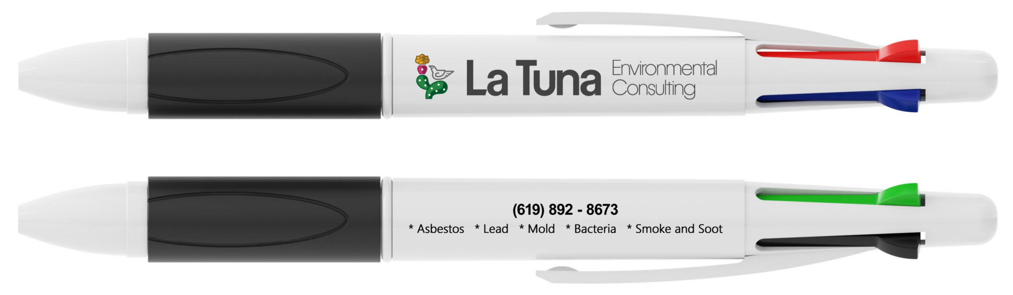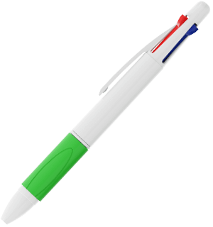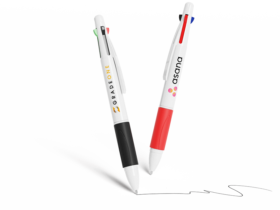 The Quad is a classic 4 color pen that boasts blue, red, green and black ballpoints in the 1 model. Each color option reveals and retracts via the click sliders at the top of the pen. The comfortable thermoplastic rubber grip is available in a variety of colors to complement your brand style. The exterior white shell can be Photo Printed with your logo, slogan and more.