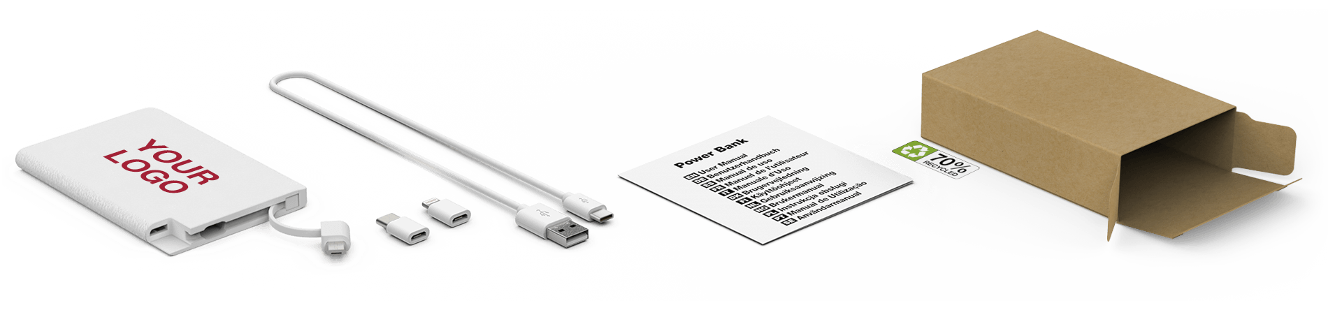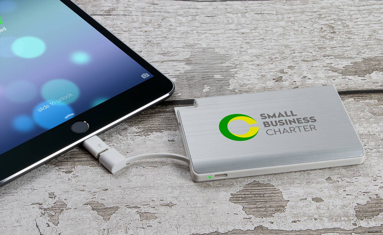 Charge your device in style with our Tour Power Bank. Finished with supple leather, the Tour can have your logo or brand message Screen Printed onto both sides. The Tour also features a tethered Micro-USB cable, a Lightning adapter and a USB-C adapter, ensuring all of the main device connector types are covered, including iPhone™, iPad and Android devices.